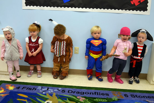 The CDC had a little Halloween Party on Halloween. All the kids got to dress up and trick or treat amongst each other in the hallways. The older kids got to go to the office area to trick or treat with all the staff. Here is Colt's class. There are a bunch of them and they were SO excited! Jake is making silly face in the back...mmmmm